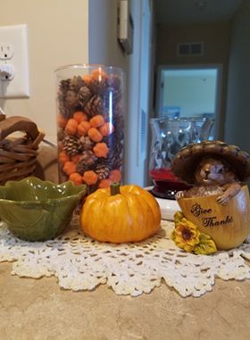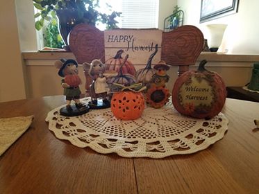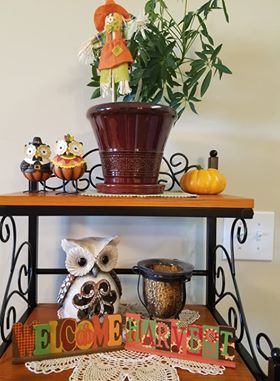 Spring and summer we put up some birds, frogs and small plaques with summer type sayings or quotes. For fall we have the colors of Fall, scented candles of cinnamon, pumpkin, apple pie, she found some small straw people to stick in a few of her plants, Happy Harvest plaques and owls dressed in the fall colors and so on. Then winter my wife loves snowmen, she tries to find a different one each year to add to her collection. We have fake snow and set up winter scenes. At Crackle Barrel we found a decoration in the form of a deer antler with a fox, squirrel, and cardinal on in the snow.