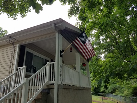 We were so excited to have our own front porch that we went out and purchased an American flag and hung in on a corner post and then we began to furnish it with rocking chairs, a glider, plants and a wind chime.